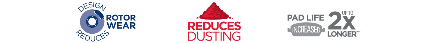 Les formes spécifiques à la plateforme et les formulations de friction exclusives permettent de prolonger la durée de vie des plaquettes jusqu’à deux fois, de retenir moins de poussière et de réduire l’usure des disques**. La conception augmente l’écoulement d’air turbulent pour une meilleure dissipation thermique tandis que la forme de la plaquette garantit des performances optimales sur le plan du bruit, des vibrations et des secousses.